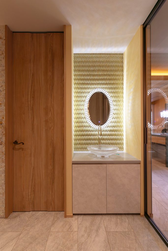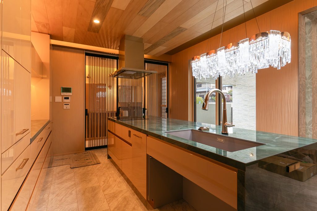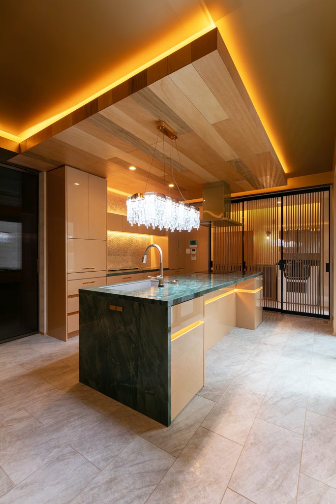 大理石の天板や光沢のある面材、シャンデリアや間接照明はショールームの様な仕上がりです。