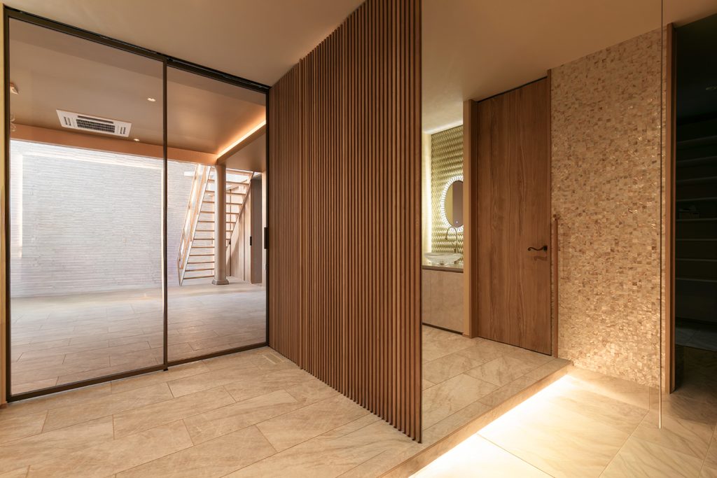 玄関からリビングに続くタイル敷きと、ガラスの建具が空間に広がりをもたらし、壁と一体となった木製建具の存在感がとても豪華に感じられます。
