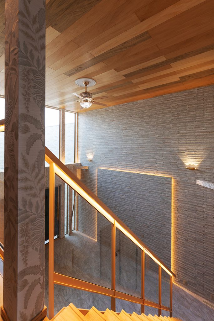 2階から降りてくる様は、シンデレラ階段を想像させます。 ゴージャスなゴールドの手すりと間接照明は、憧れの的です。