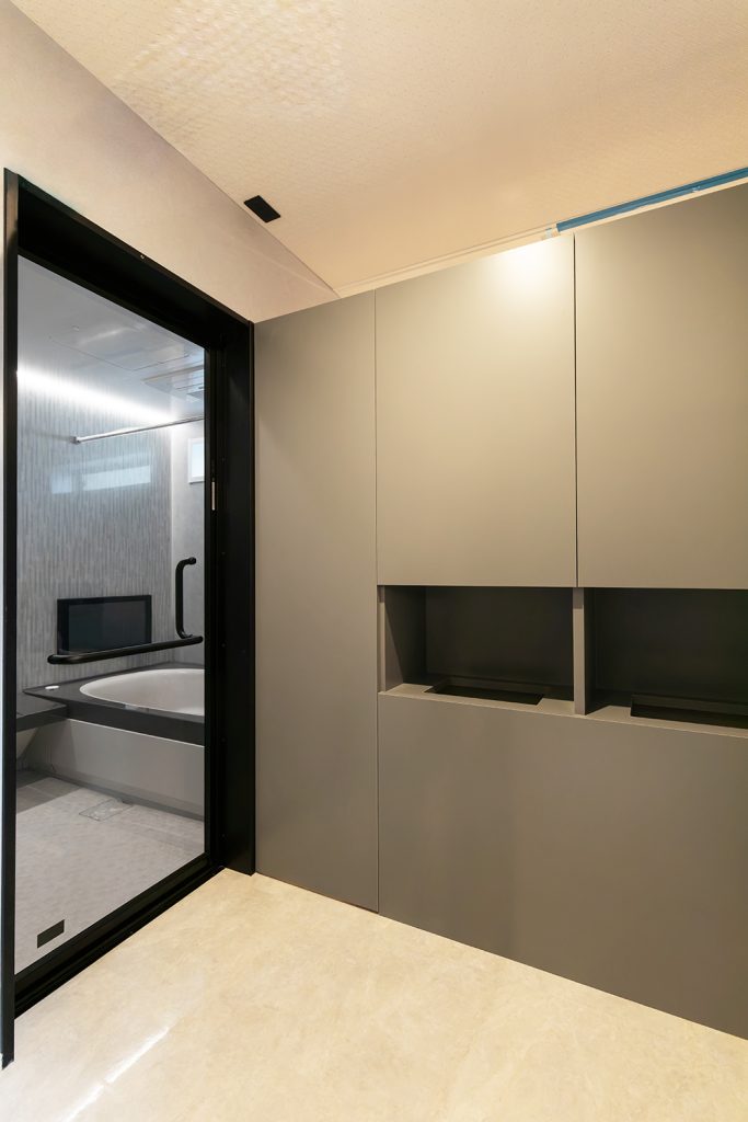 脱衣室では、両側利用収納を活用し、洗濯物をランドリー室へワンアクションで移動できます。